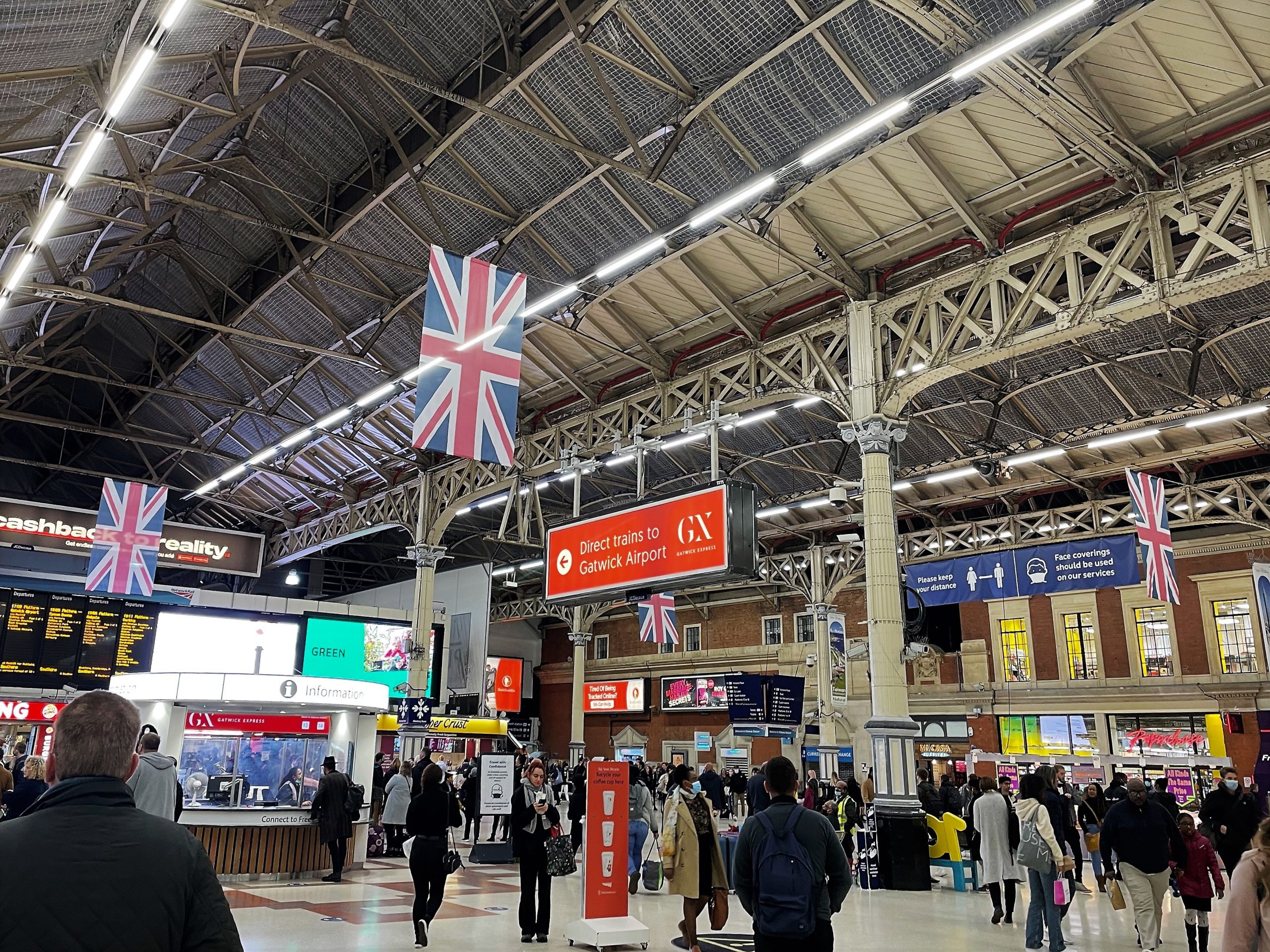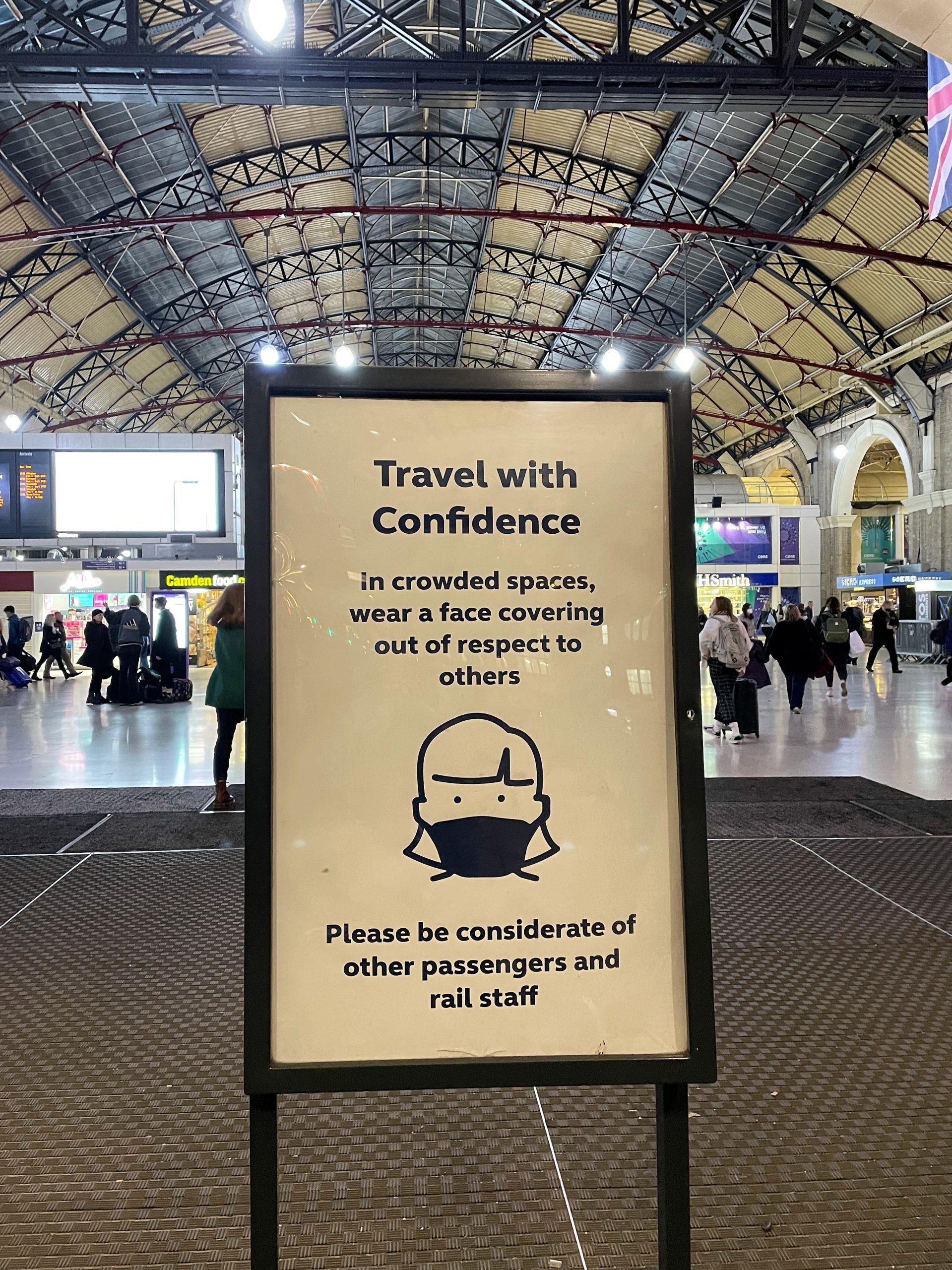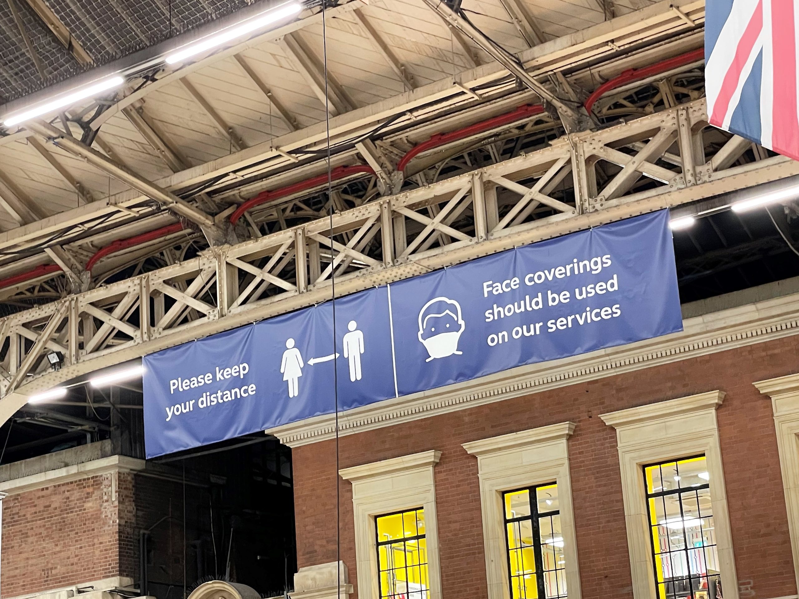 ロンドン・ヴィクトリア駅には、《ソーシャル・ディスタンス》《マスク着用》を呼びかける看板や垂れ幕が設置されていました。しかし構内では、マスクを着けていない人もかなり多い印象でした。